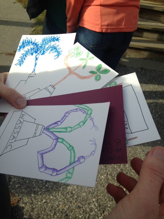 Our final public event during our residency at the Wassaic Project was an hour-long interactive artist-led walking tour. After exploring interior stairways and architectural elements of residency’s main studio building, we flagged stairs and “unstairs” in the hamlet, reimagined a community message board, used a fence to dictate movement and designed different monuments to Wassaic. These imaginary monuments were then sent to Field Trip participants by postcard, with each person receiving someone else’s drawing, days after the event.