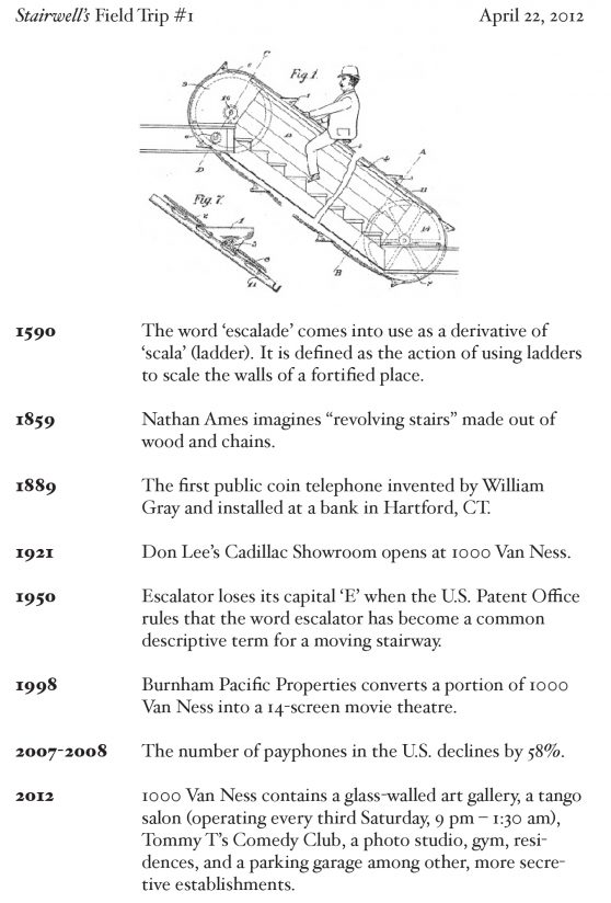 The inaugural Field Trip led a group though 1000 Van Ness, home to six floors of escalators leading to an AMC Theaters. Artist Carrie Hott narrated a history of the escalator (as both object and word) while riding the escalator. Stairwell’s co-directors Carey Lin and Sarah Hotchkiss then pointed out interesting architectural elements as the group descended, allowing participants to contribute their own escalator-related stories to the conversation.