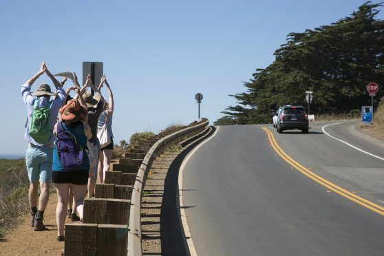 During this Field Trip, we investigated retroreflectors in the Headlands’ bathroom, used road signs and passing cars to enact a site-specific “car-eography,” walked with our eyes closed across a narrow bridge, let partners guide us over uneven terrain with only verbal cues and took in a rare moment of silence along a wooded path. Then we ate a delicious lunch.