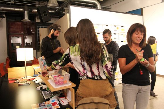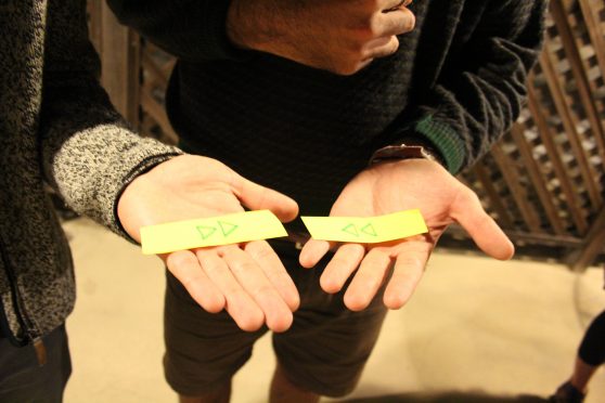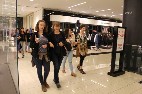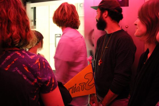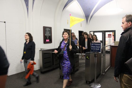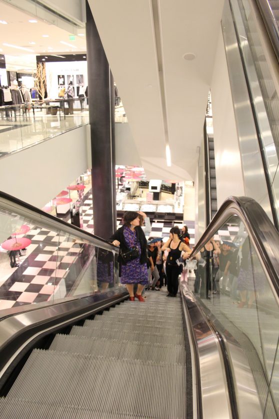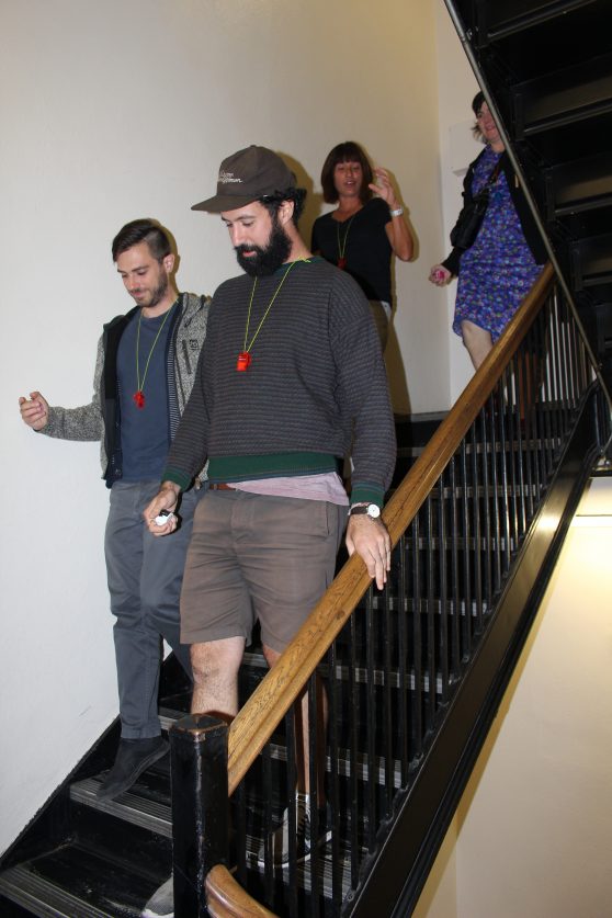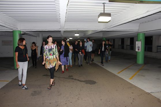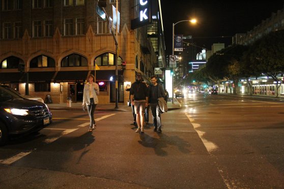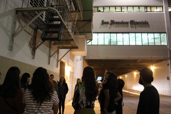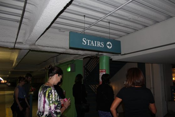 This special evening walking tour, commissioned by Intersection for the Arts on the occasion of the nonprofit’s 50th anniversary, wound its way through the SoMa neighborhood. We explored various indoor and outdoor stairs (some public, some you’d never know were there), starting with the Chronicle’s rooftop break area. We walked through the Fifth & Mission Parking Garage and inside Macy’s (much to the staff’s confusion) for various sensory-based activities before returning to Intersection for stacked snacks and prize distribution.