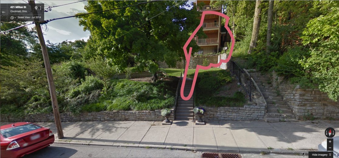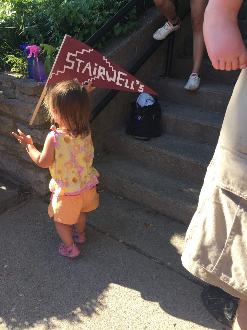 For our second and final Cincinnati Field Trip, we explored the steps in and around Mt. Auburn. We paid special attention to the lizards in the neighborhood, announcing sightings with noise-making devices. Also interesting within this walk were several rogue sidewalk markers pressed by municipal workers into the concrete. Games were played (one including odd-shaped balls, the other a version of charades), note was taken of an architectural set piece in the 1993 movie Airborne, and we concluded the Field Trip at Milton’s Prospect Hill Tavern with cold refreshments.