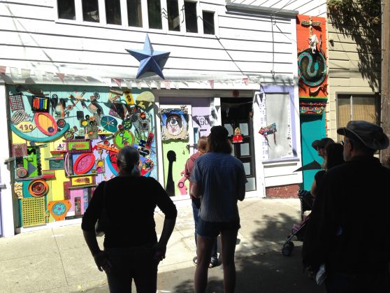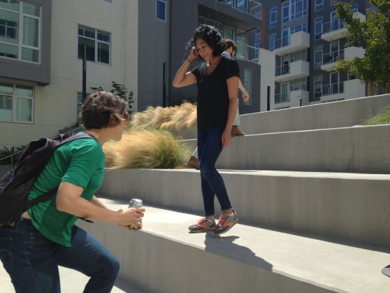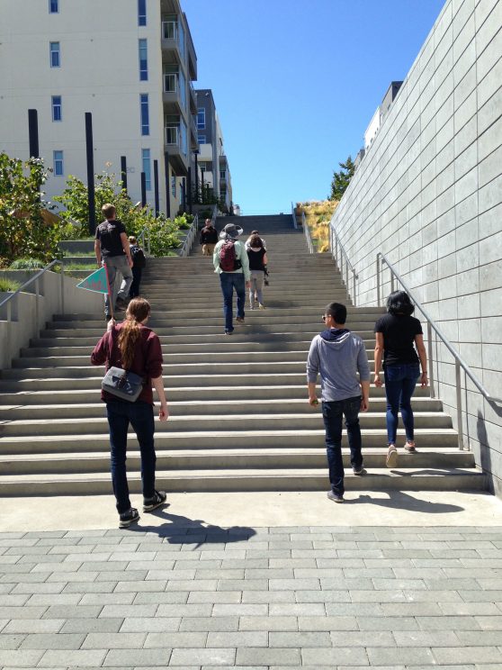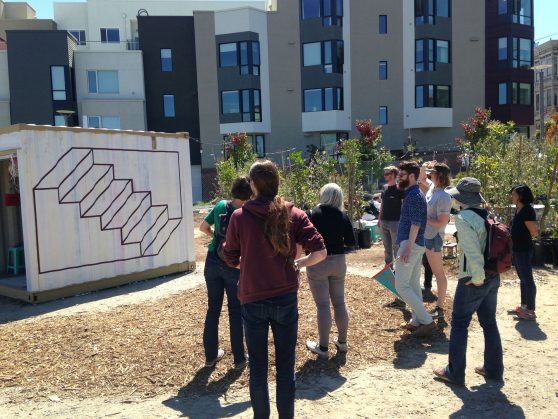 At the culmination of our Hayes Valley Art Works residency, Stairwell’s hosted a free public event with participatory activities, a short walking tour, stair-themed refreshments and an awards ceremony with unique handmade trophies. Together, we explored the HVAW site and surrounding area and took part in circuit training of the non-athletic variety. These activities included coming up with alternative “backronyms” for O.S.O.C., the letters we found scrawled on the inside of our shipping container residency studio. Visitors were also invited to take a closer look at building facades and rooftops to count the many satellite dishes nestled amongst the dense urban landscape.